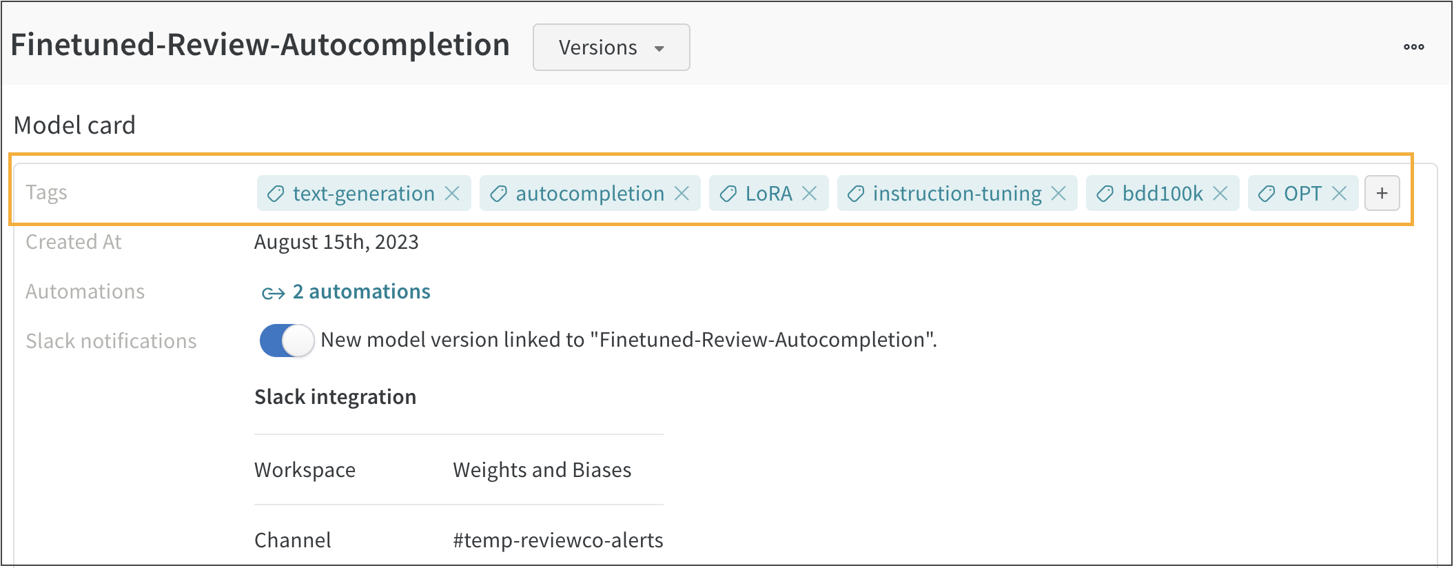 태그의 이름을 입력하거나 기존의 모델 태그를 검색합니다. 예를 들어, 다음 이미지는 FineTuned-Review-Autocompletion이라는 등록된 모델에 여러 모델 태그가 추가된 것을 보여줍니다: