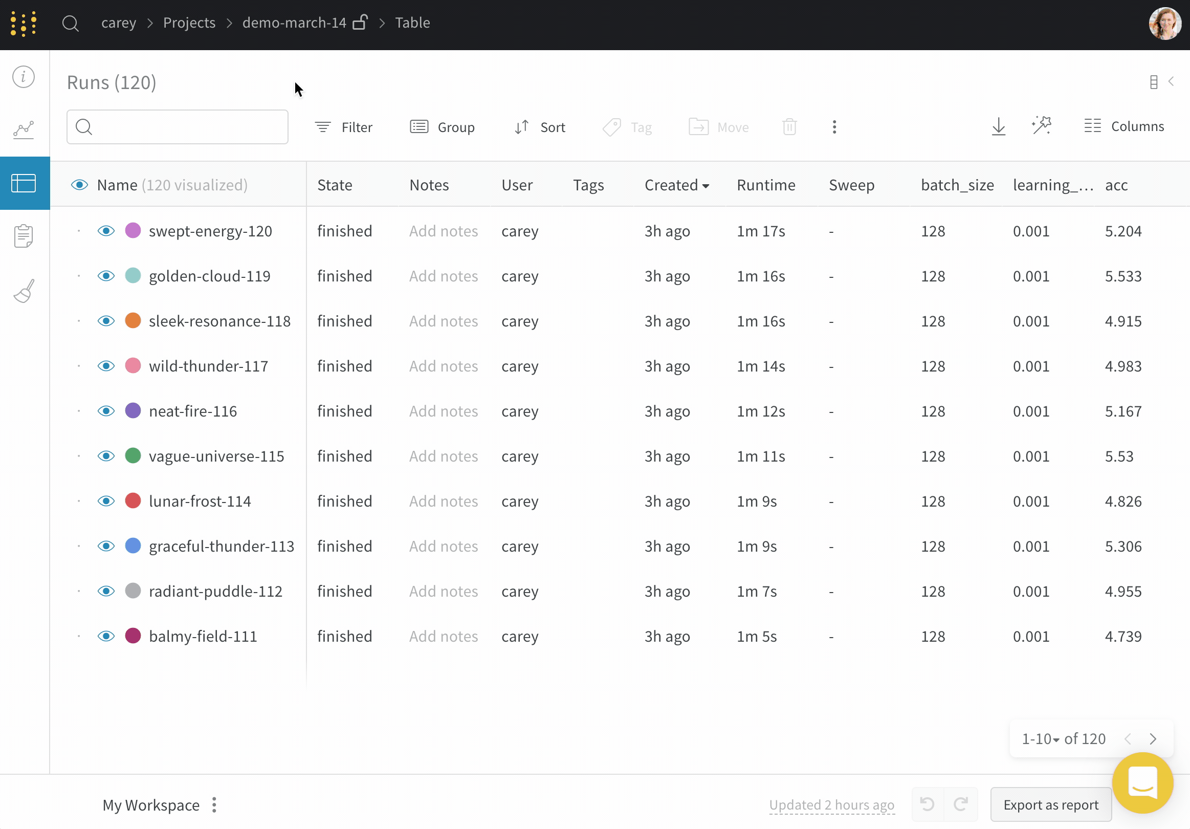 - 모든 런을 선택하려면 체크박스를 클릭합니다