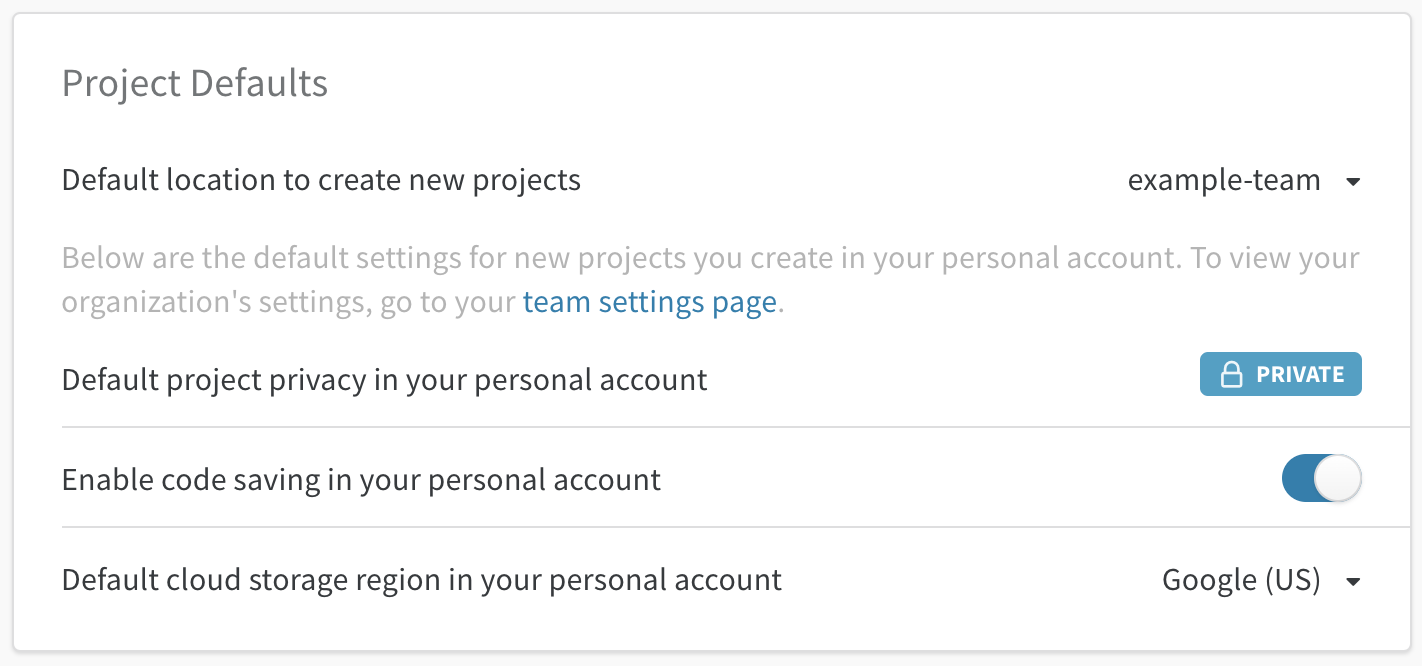 팀에 가입하면 기본 엔터티가 업데이트됩니다. 이것은 설정 페이지에서 새 프로젝트를 생성하는 기본 위치가 방금 가입한 팀으로 변경되었음을 의미합니다. 다음은 해당 설정 페이지 섹션이 어떻게 보이는지의 예입니다: